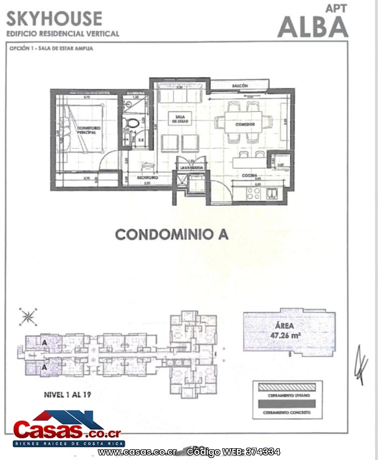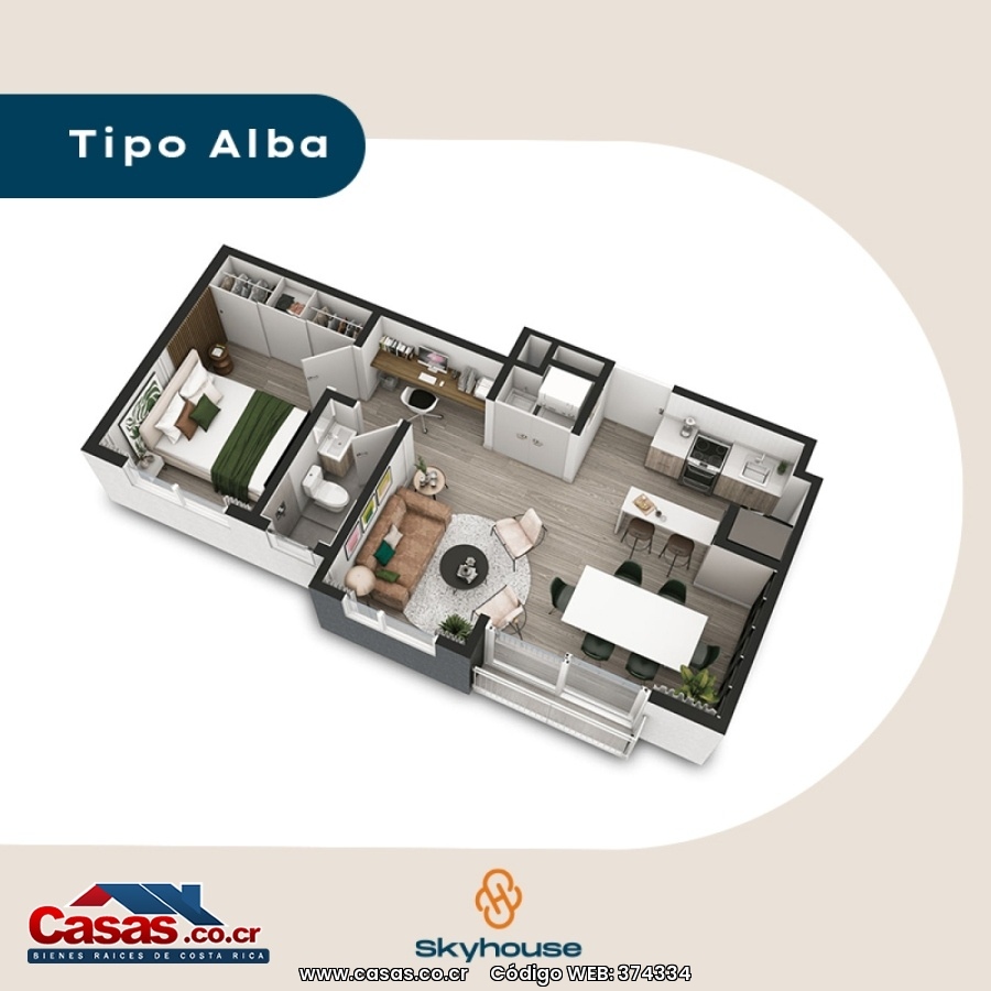 --CARACTERÍSTICAS-- • Modelo: Alba - 47.26 m² • 1 habitación con walking clóset • 1 baño • 1 espacio de parqueo • Sala Amplia